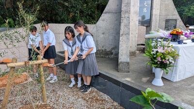 10月10日南風原町祈和之塔で南風原町慰霊祭が行われ、本校から平和実行委員会の赤嶺さんと真志喜さんが参加しました。オリーブの木を戦後80年記念として植樹しました。南風原町では10月12日を「南風原町民平和の日」と制定しています。