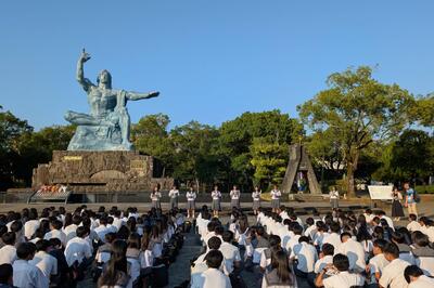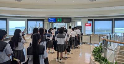 15日那覇空港出発し、福岡空港到着後、長崎市内のエリア学習を行い。原爆資料館見学、平和祈念像前で献花と詩の朗読を行いました。天候にも恵まれています。