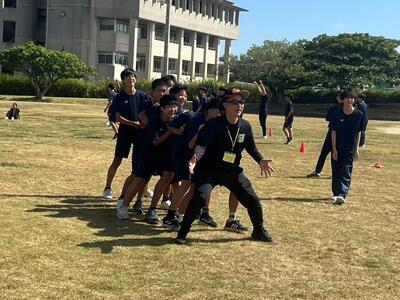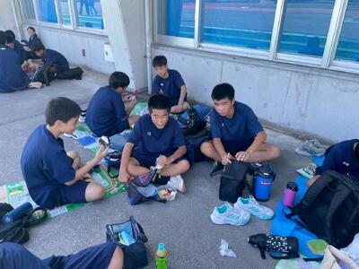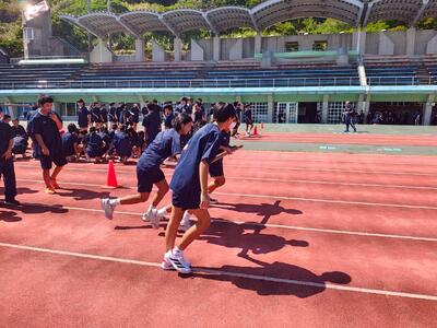 校区内の石獅子や、かすり会館などのチェックポイントを班ごとで協力して回っていました。競技場では、みんなで仲良く昼食(お弁当)を囲み、学年レクで学級・学年の仲を深めました。