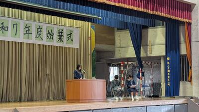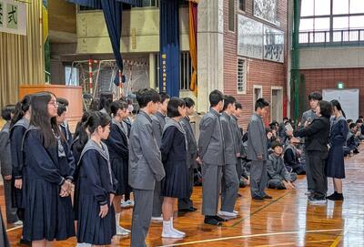 1月6日、1校時に体育館で始業式と3学期の役員認証式を行いました。各学年代表(1学年:儀保さん、2学年:小渡さん、3学年:城間さん)が3学期の抱負を発表と校長先生からのあいさつがありました。その後、3学期の役員認証式を行いました。