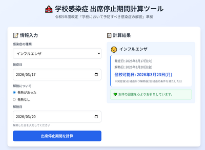 学校感染症出席停止期間計算ツールを養護教諭が作成しました。