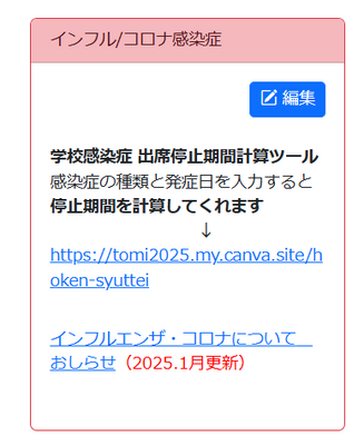 お子さんが感染症にかかってしまった場合の登校可能日を自動で計算してくれます。ご活用下さい。