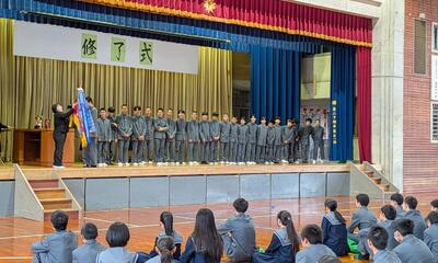 3月23日1校時に修了式を行いました。式の前に今年度最後の表彰式(野球部、おきでんプレゼンツ第48回沖縄青少年科学作品展 沖縄電力社長賞、日本語検定、英検)を行いました。修了式では、各学年のあいさつの後、校長先生から修了認定が行われました。1年間多くの成長がありました。修了おめでとうございます!